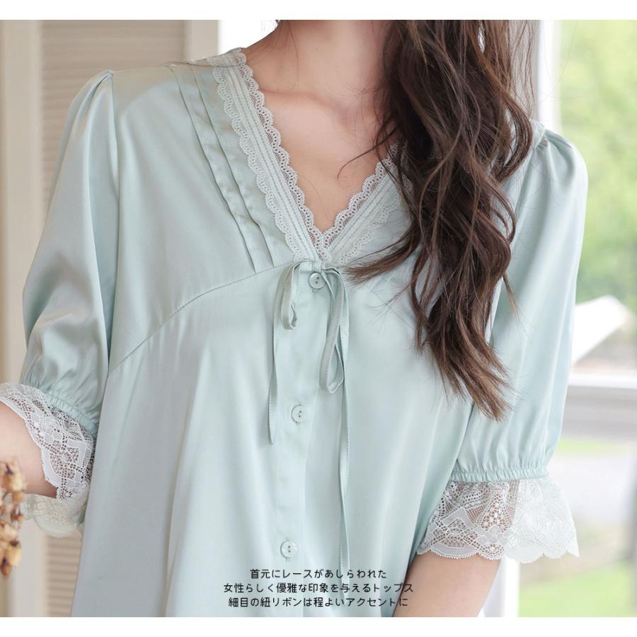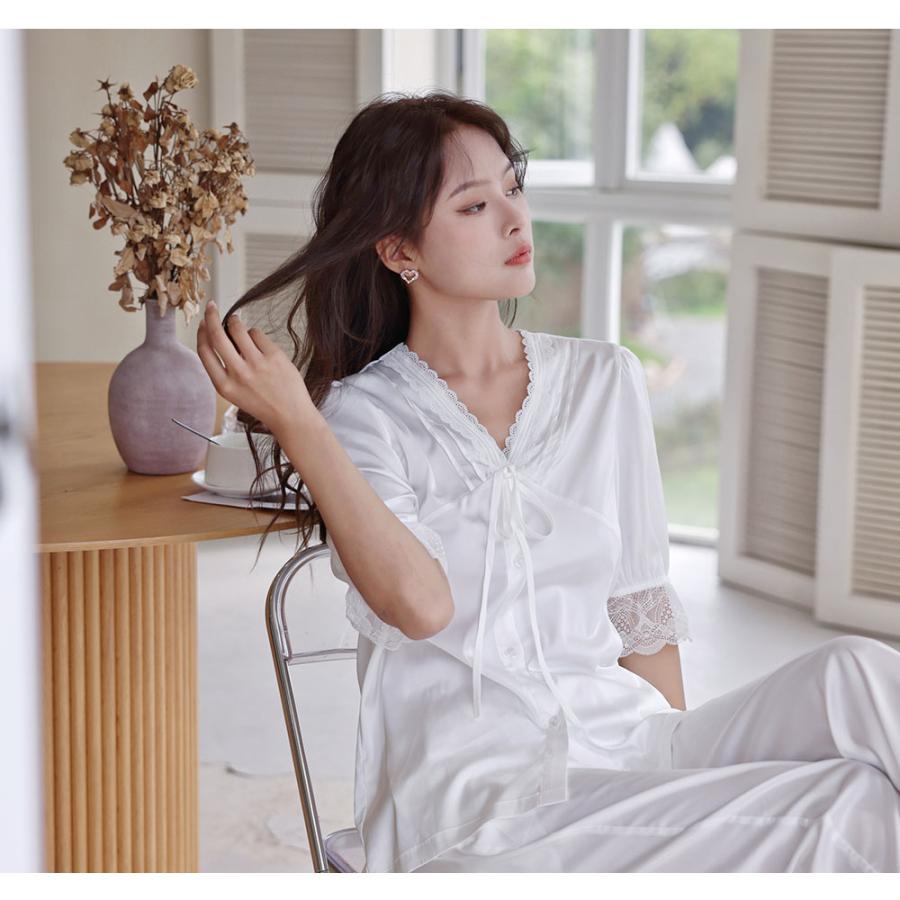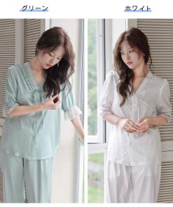 【ルームウェア限定!半額50%OFF】ルームウェア レディース 半袖 ロングパンツ 上下セット パジャマ 部屋着 セットアップ 春 夏 ホワイト グリーン